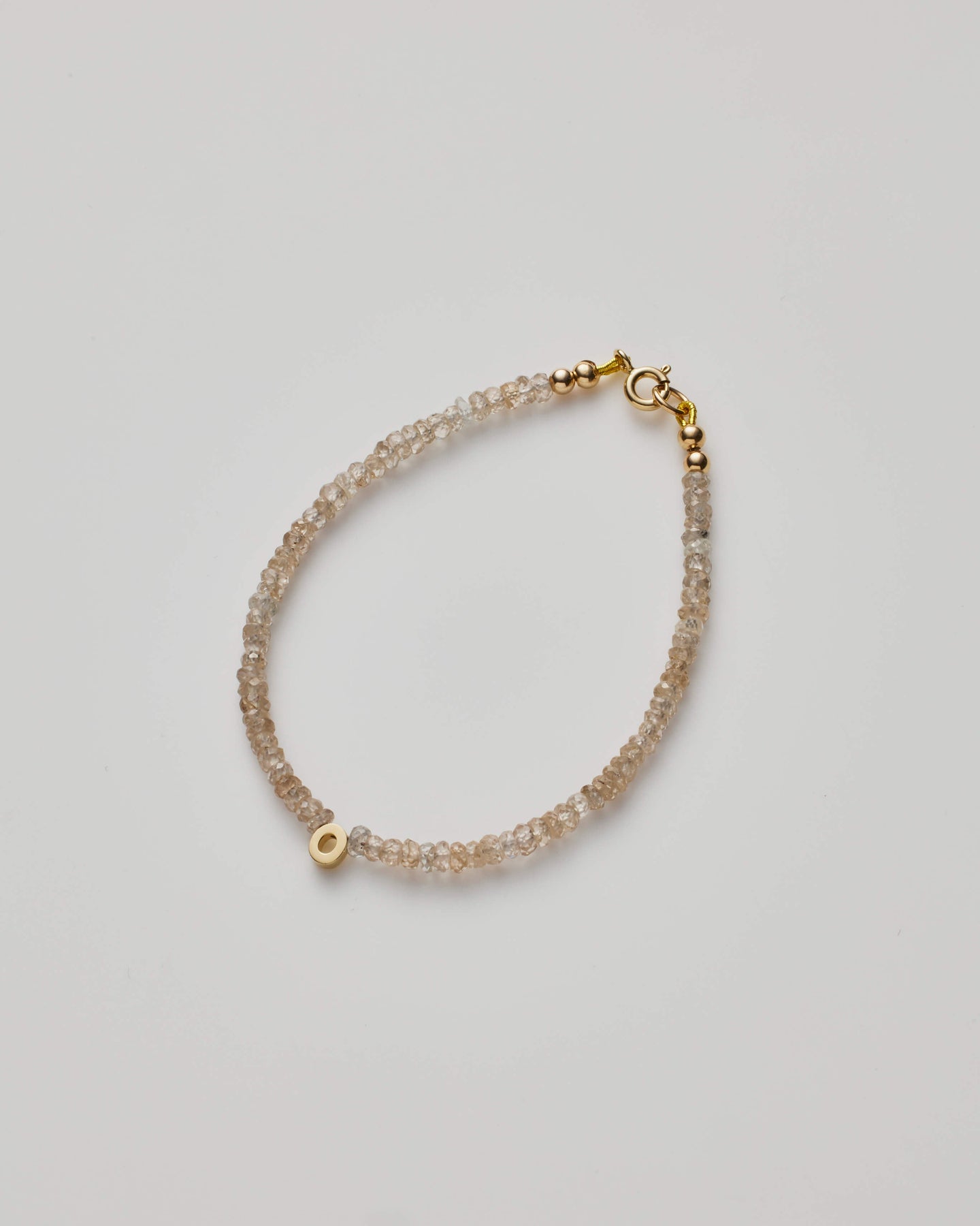 Solid 14K gold bracelet with Champagne Zircon beads and a solid gold letter charm
